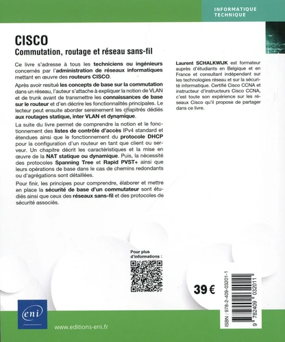 Ce livre s’adresse à tous les techniciens ou ingénieurs concernés par l’administration de réseaux informatiques mettant en oeuvre des routeurs CISCO. Après avoir resitué les concepts de base sur la commutation dans un réseau, l’auteur s’attache à expliquer la notion de VLAN et de trunk avant de transmettre les connaissances de base sur le routeur et d’en décrire les fonctionnalités principales. Le lecteur peut ensuite aborder sereinement les chapitrés dédiés aux routages statique, inter VLAN et dynamique.