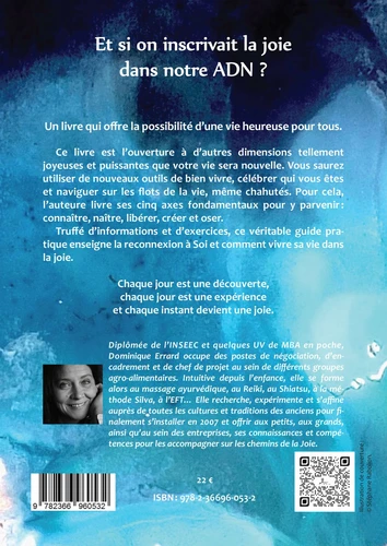 Un livre qui offre la possibilité d’une vie heureuse pour tous. Ce livre est l’ouverture à d’autres dimensions tellement joyeuses et puissantes que votre vie sera nouvelle. Vous saurez utiliser de nouveaux outils de bien vivre, célébrer qui vous êtes et naviguer sur les flots de la vie, même chahutés. Pour cela, l’auteure livre ses cinq axes fondamentaux pour y parvenir ;: connaître, naître, libérer, créer et oser.