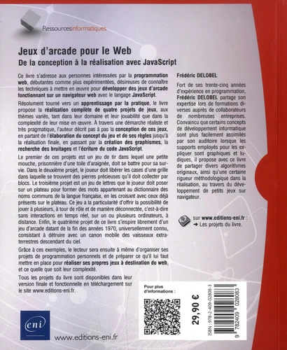Ce livre s’adresse aux personnes intéressées par la programmation web, débutants comme expérimentés, désireux de connaître les techniques à mettre en oeuvre pour réaliser des jeux fonctionnant sur navigateur. L’auteur y explique la conception de jeux plus ou moins complexes, en partant de la description de ce qui est souhaité jusqu’à la réalisation finale, en passant par la création des graphismes, la recherche des bruitages et l’écriture du code JavaScript, décrite pas à pas.