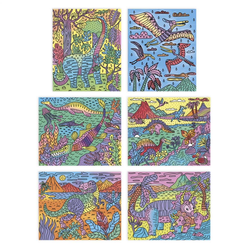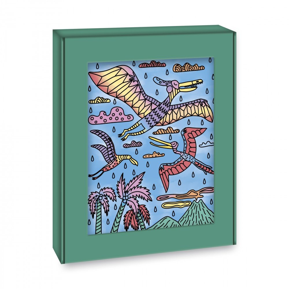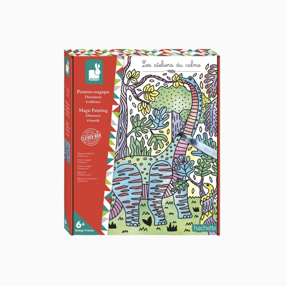 Rrrrr ! Donne de belles couleurs à tes dinos ! Ce kit composé de 6 tableaux à peindre à l’aide d’un pinceau à réservoir d’eau vous réserve bien des surprises ! Les couleurs apparaissent lorsque l’on mouille les contours noirs des illustrations avec le feutre à eau. Attention, il faut faire preuve de minutie pour que les couleurs ne se mélangent pas entre elles. Le livret explicatif aidera l’enfant pas à pas pour donner vie à ses jolis tableaux ! Le petit plus ? Le packaging se transforme en un cadre pour mettre en valeur ses belles créations ! Un tableau nécessite environ 1 h. Cette activité développe la motricité fine et la patience. Activité manuelle pour les enfants à partir de 6 ans.