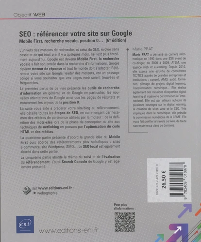 La première partie présente les outils de recherche d’information en général, et de Google en particulier, les nouvelles orientations de Google ainsi que les pages de résultats et notamment les enjeux de la position 0. La suite vous aide à préparer votre site/blog au référencement, elle détaille toutes les étapes de SEO, en commençant par l’examen des critères de pertinence utilisés par le moteur : de la définition des mots-clés lors de la phase de conception du site aux techniques de netlinking en passant par l’optimisation du code HTML et des médias.