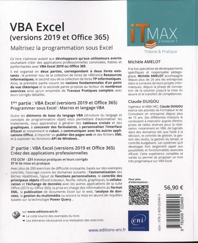 2e partie : VBA Excel (versions 2019 et Office 365) – Créez des applications professionnelles 172 QCM – 231 travaux pratiques et leurs corrigés – 37 H de mise en pratique. Avec plus de 200 exercices de difficulté croissante, basés sur des exemples concrets, l’ouvrage couvre les domaines suivants : l’automatisation des tâches répétitives, l’ajout de fonctions personnalisées, le contrôle des principaux objets d’Excel (classeur, feuille, cellule, graphique), la collaboration et l’échange de données avec les autres applications de la suite Office (2019 ou Office 365), la prise en charge des informations au format XML, la publication de documents Excel sur le Web, l’analyse de données, la gestion du multimédia ou encore la mise en oeuvre de requêtes basées sur la technologie Power Query.