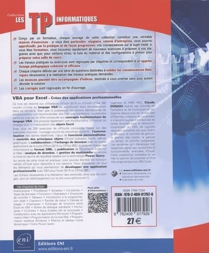 Au terme de cette mise en pratique, vous pourrez étendre à l’infini les fonctionnalités d’Excel. Vous disposerez de tous les éléments qui vous permettront de développer une application professionnelle avec VBA pour Excel 2019 ou Office 365.
